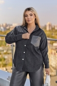 Сорочка вільного крою, з накладною кишенею еко-шкіри на грудях і вставкою на плечах, спереду з застібками- кнопками. Штани -спереду еко-шкіра, ззаду-мікро вельвет, вільного прямого крою з кишенями, високої посадки,в талії на резинці.