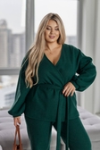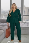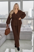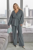 Костюм "ЛЕТ-569Комплект складається з вільного жакета із запахом і пояса та прямих широких брюк. Жакет: фасон кимоно, вільного силуету, без застібки, з поясом для регулювання об’єму талії. Рукав довгий, зі спущеною лінією плеча, з м’яким збиранням біля манжетів. Брюки: прямого вільного крою, з еластичним поясом,висока посадка.