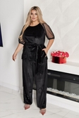 Зріст моделі 170см.На моделі одягнений: 52-54 розмір. Параметри моделі на момент зйомки:БЛОНДИНКА:ОГ- 115 см.ОТ- 83 см.ОБ- 120 см. ФАСОН ТА ДЕТАЛІ:Костюм двійка — кофтинка і штани з делікатним блиском. Кофтинка з сітчастими рукавами ¾ і поясом, який підкреслює талію. Штани прямого крою палацо з кишенями, що забезпечують комфорт і свободу рухів. Пояс на резинці. ДОДАТКОВІ ХАРАКТЕРИСТИКИ: Дуже гарний святковий і стильний костюм. Тканина — м’який велюр бархат із впаянною паєткою, яка дуже добре тримається і не відчувається на дотик, костюм еластичний, приємний до тіла. Рукави з сітки, теж з впаянною паєткою, додають легкості й жіночності. Блискучий ефект тканини створює святковий, але стриманий образ.Ідеальний варіант для корпоративів, святкового відпочинку, так і для стильного casual-look.