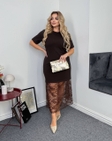 Заміри виробу по зовнішньому шву:Розмір 46-48: Плаття Обʼєм грудей 102-108Обʼєм талії 96Обʼєм стегон 104-112Плечі 42Рукав 27Довжина по спинці 91СпідницяОбʼєм талії 66-84Обʼєм стегон 120-126Довжина 99