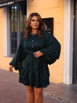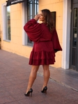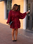Сукня коротка, виконана з легкої, трохи блискучої тканини. Вільний фасон, з акцентом на талії завдяки поясу-стрічці. Довгі рукава, широкі, вільно спадають, надаючи образу романтичності та легкості. Зверху застібка на ґудзики спереду, що додає класичної нотки. Спідниця з двома ярусами воланів, які створюють об’єм та динаміку.