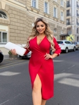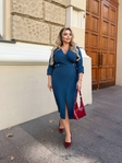 Плаття приталенного крою , ззаду молнія , на талії та рукавах ґудзики , низ та верх плаття на запах.