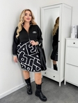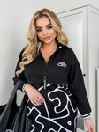 Плаття спорт шик, вдала комбінація однотону з принтом, робить виріб витонченим та оригінальним, привертає погляди. Рукава та низ прикрашені чорно-білими лампасами, горловина стійка на молнії з карабіном ( внутрішня частина горловини прикрашена принтом з буквами), на грудях накат з камінцями, з боків дві кишені. Рукав-реглан вільного крою. Плаття цікавого крою : планочка спереду та ззаду, підкреслює ваші принади та приховує зайві обʼєми на талії.