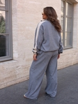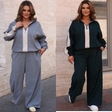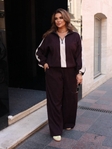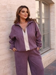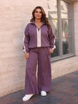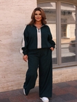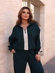 Вільний світшот на блискавці до грудей із коміром-стійкою. Рукави довгі, з гумкою на манжетах. Широкі прямі штани того ж темно-зеленого кольору, виконані в розслабленому вільному крої.