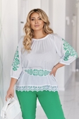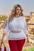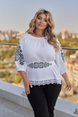 Блузка з легкої тканини штапель, прикрашена орнаментом-аплікацією на рукавах та по лінії талії на поясі.