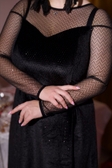 ФАСОН ТА ДЕТАЛІ: Сукня з преміального велюру з впаянною паєткою — матеріал ніжно блищить і створює святковий, дорогий вигляд. Верх виконаний із сітки з паєткою, що додає інтриги, легкості та витонченості. Красивий фігурний виріз по велюру під сіткою робить акцент на зоні декольте, але залишається стриманим та елегантним. Рукав довгий, повністю із сітки — делікатний, легкий, комфортний. Силует А-подібний — гарно витягує фігуру, приховує зайве і пасує плюс-сайз красуням.