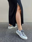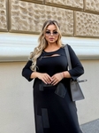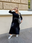 Довге плаття в підлогу , прикрашене шкіряними вставками + робоча молнія на грудях , які привертають увагу, як цікава родзинка. З боків по низу плаття дві робочі молнії .